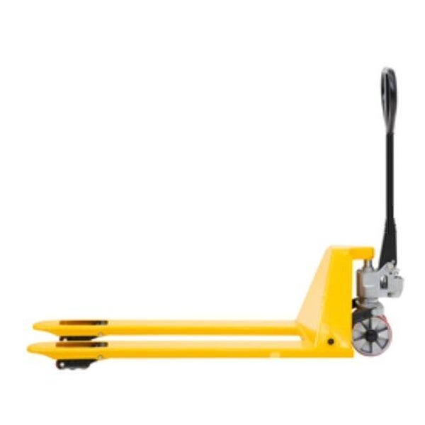 Deze extra lage palletwagen heeft een hefvermogen van 2000KG en een extra lage inrij hoogte van 52mm. Dit maakt het mogelijk om speciale extra lage pallets of goederen te heffen. Waar een normale palletwagen een inrij hoogte heeft van 85mm.