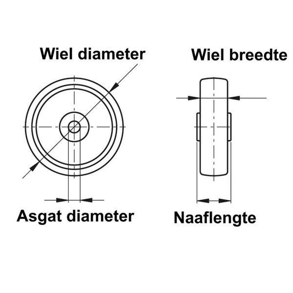 Wij adviseren altijd de maten van uw vorkwiel op te meten zodat u het juiste vervangende wiel kan bestellen. Bij de afbeeldingen staat een duidelijke uitleg over welke maten u moet opmeten.